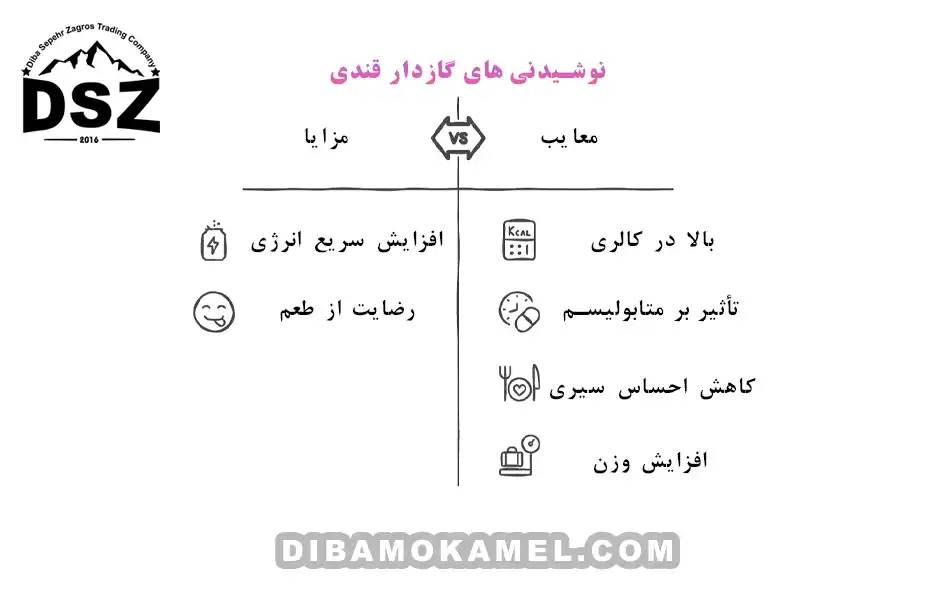 | نوشیدنی های گازدار سرشار از قند و کالری هستند و هیچ ارزش غذایی ندارند. مصرف این نوشیدنی ها می تواند باعث افزایش چربی بدن و پوسیدگی دندان ها شود. |